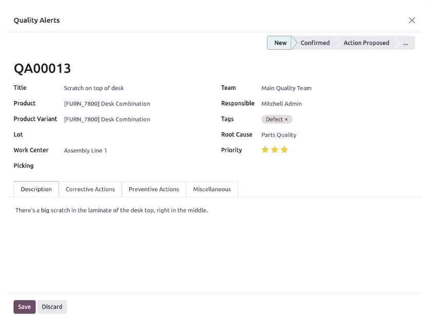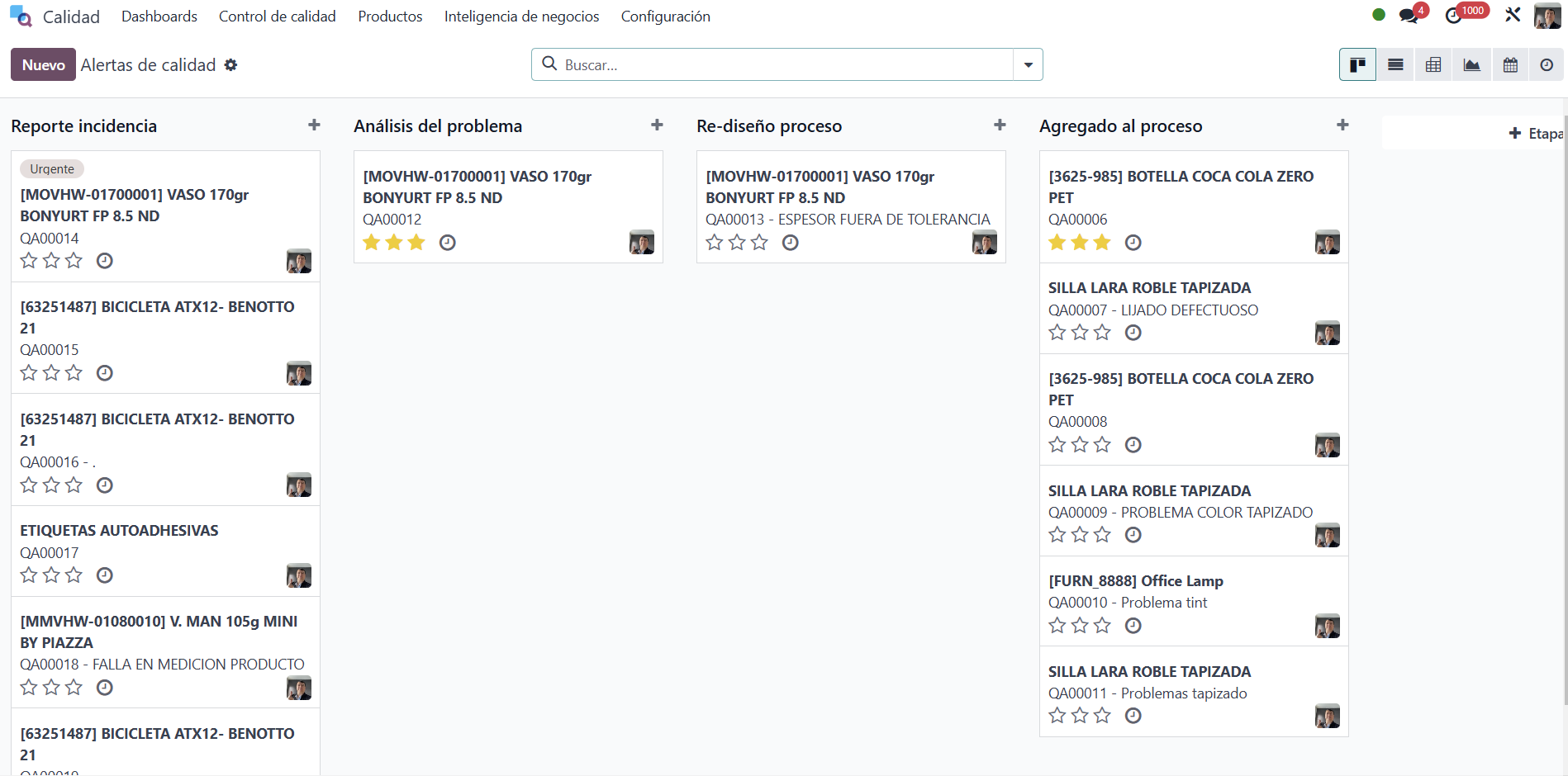 Crea alertas de calidad para corregir los problemas detectados en los productos, especifica las causas de origen y sugiere medidas correctivas y preventivas.