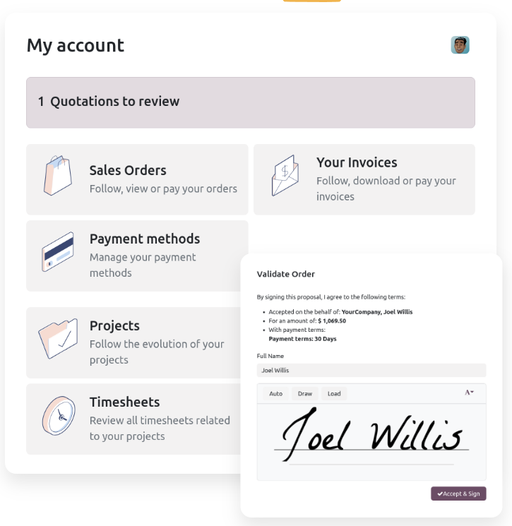 Permite que tus clientes accedan a sus documentos para que visualicen sus cotizaciones, órdenes de venta y de entrega, entre muchos otros más... Ahorra tiempo con los pagos en línea y cierra tratos más rápido con firmas electrónicas en las cotizaciones, contratos y otros archivos PDF.